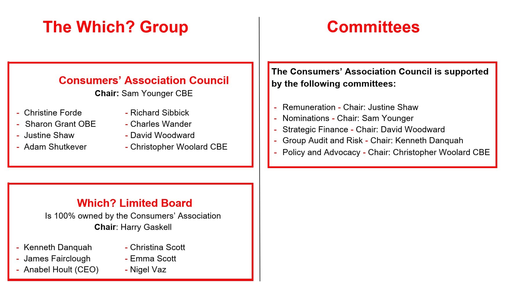 Which? Limited is governed by its own Board, which sets and oversees the commercial direction of Which?, including our magazines, paid-for digital products, legal advice service, Which? Money Helpline, Which? Switch, Which? Trusted Traders, wills and power of attorney services, and Which? Money Compare, with the aim of delivering a long-term sustainable financial return for the charity. Which? Limited is a wholly owned subsidiary of the Consumers' Association. The Board of Which? Limited is appointed by the Council of Trustees.