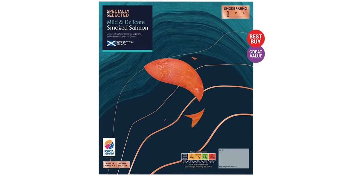 - Aldi Specially Selected Mild & Delicate Smoked Salmon, 70% – £3.09 for 100g. Available from Aldi (in-store only)