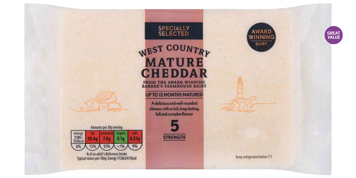 - Aldi Specially Selected West Country Mature Cheddar Cheese, 74% – £3.39 for 350g. Available from Aldi (in-store only)