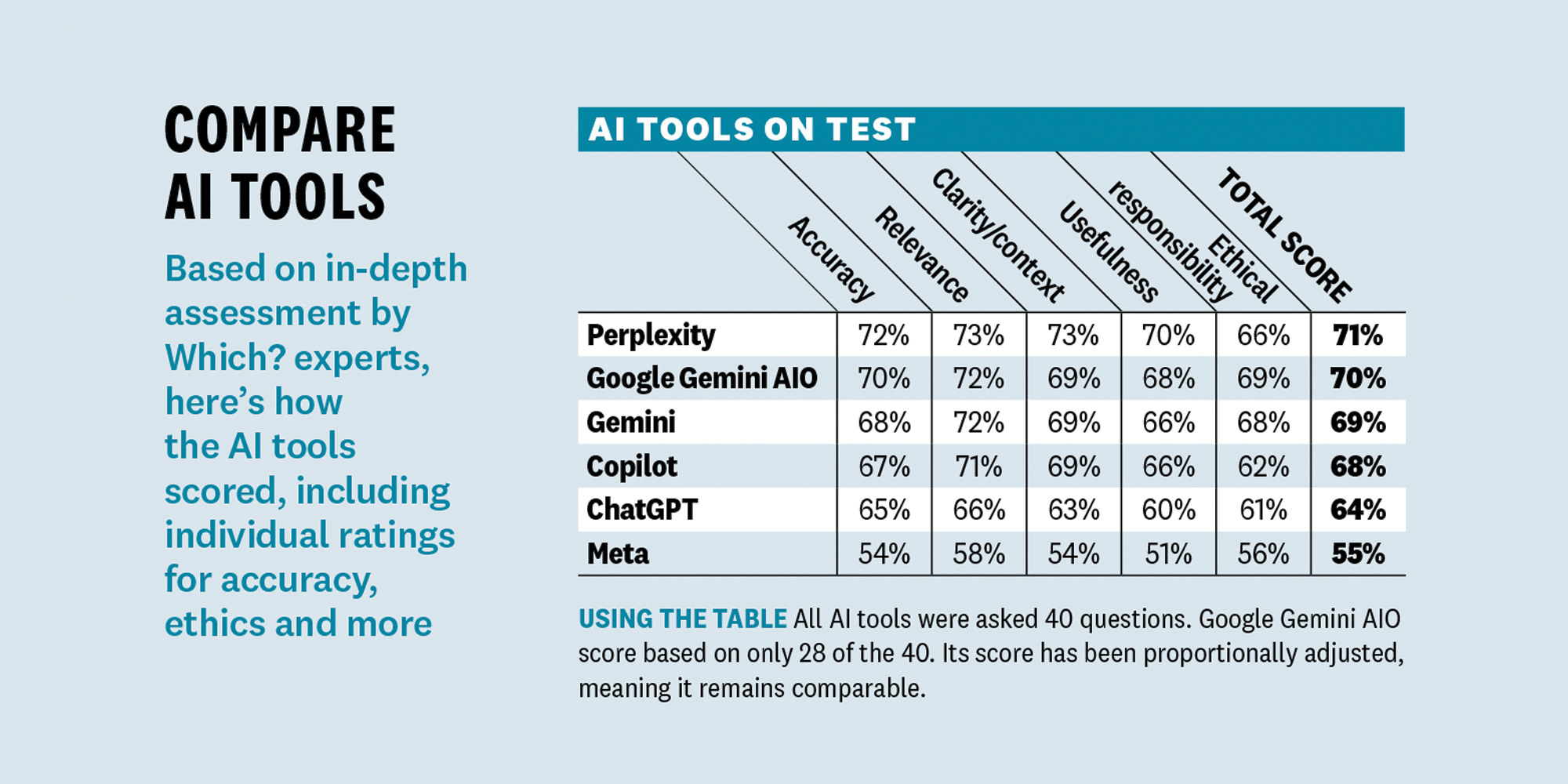 We tested six AI tools: ChatGPT, Google Gemini (both Gemini on its own and Gemini AI overviews, or AIO, in standard Google searches), Microsoft’s Copilot, Meta AI and Perplexity. They were asked a total of 40 common questions covering money, legal, health/diet and consumer rights/ travel issues. The responses were assessed by Which? experts for aspects like accuracy, usefulness and ethical responsibility.