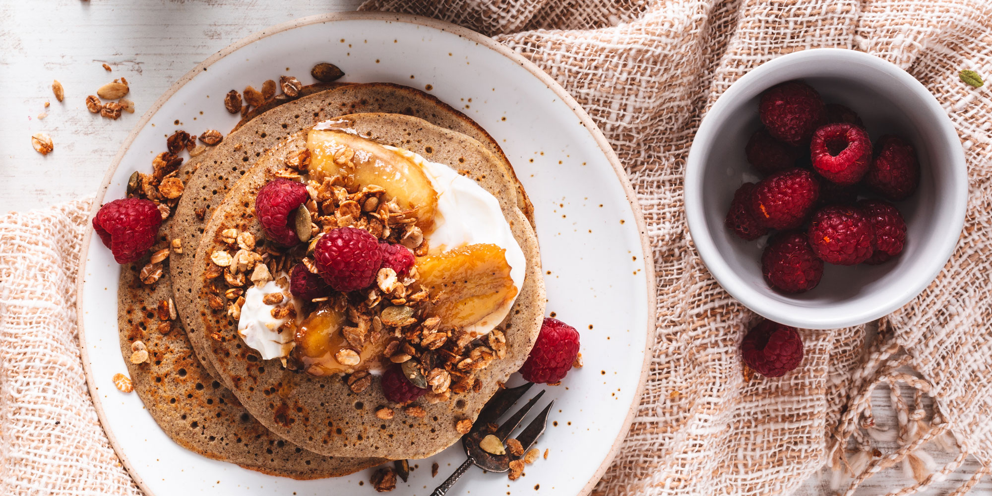 Top warm pancakes with berries or sliced banana and a spoonful of natural or Greek-style yoghurt for creaminess and protein. Finish with a drizzle of honey, if you like a touch of sweetness, and a sprinkle of seeds or chopped nuts adds healthy fats and crunch.