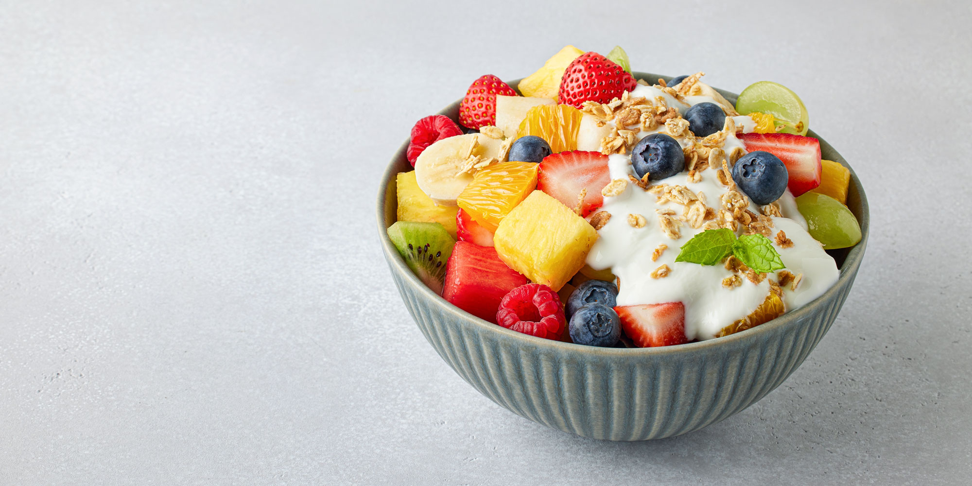 Natural yoghurt isn’t a source of fibre in itself, but it’s rich in protein and calcium. Stirring in a spoonful of porridge oats, plus fruit such as strawberries or seeds like linseeds, adds fibre and texture, while keeping it a lighter, balanced breakfast.