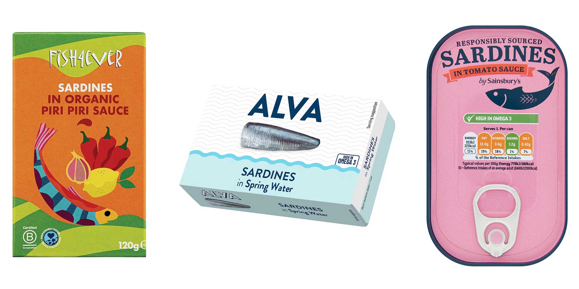 - Alva sardines in spring water, 3,570mg omega-3 per 100g (75p for 120g tin, Tesco). Same values for the brine product.