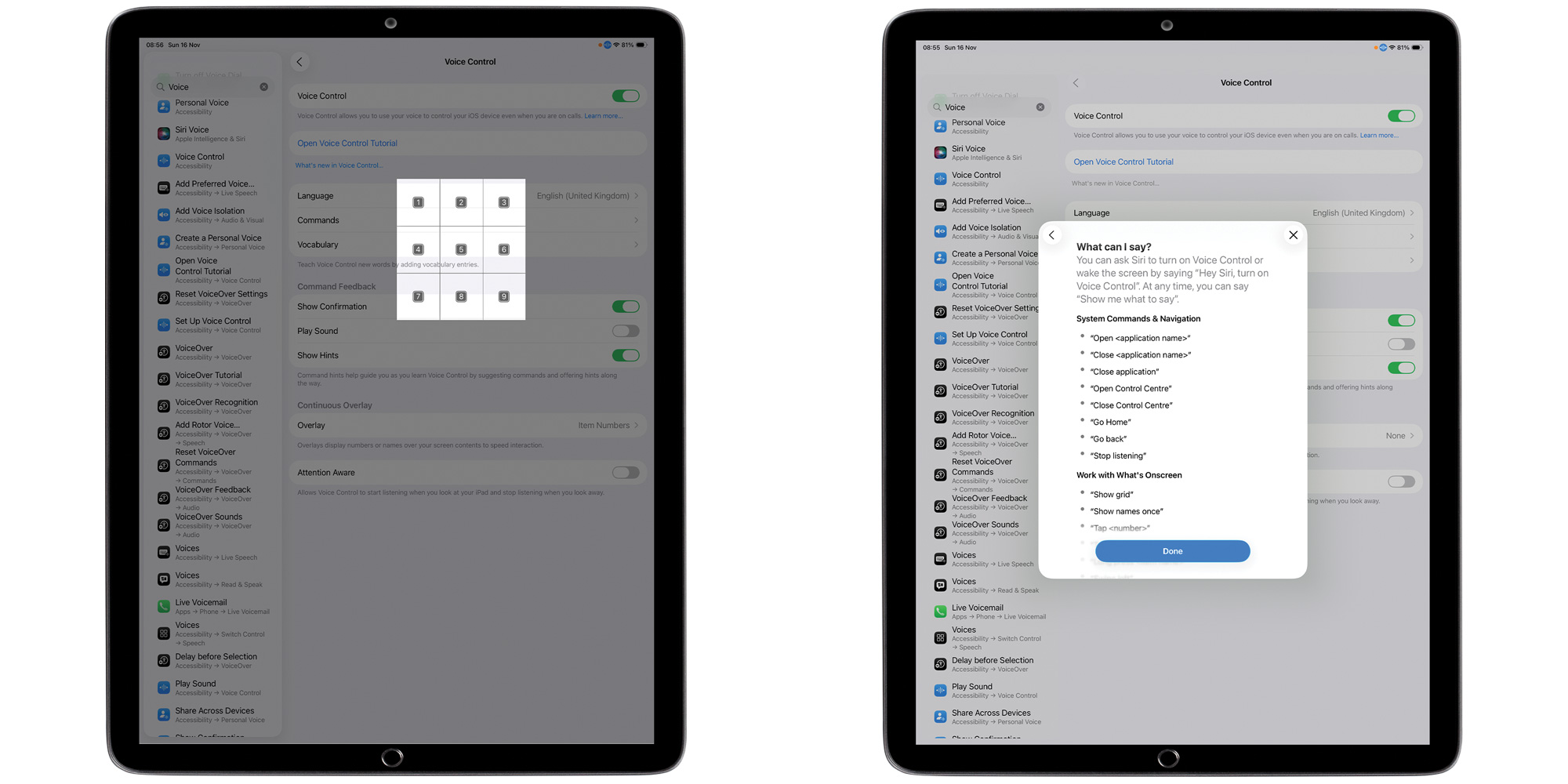 - On a Mac, go to System Settings > Accessibility > Voice Control > Commands, or ask the voice control system to show them to you – the same commands also work on an iPad.