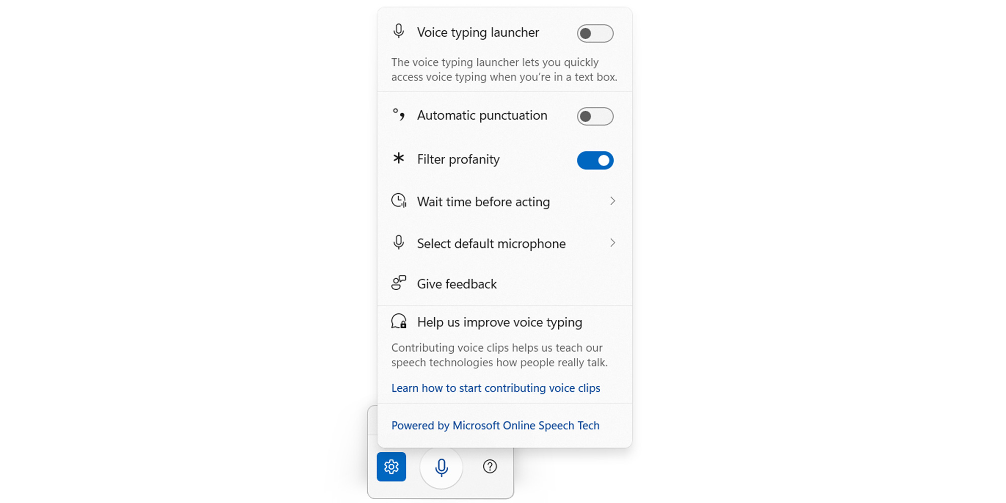 Voice Typing is more limited than Voice Access (above), focusing purely on dictation rather than controlling your PC. On Windows, you can activate it by pressing Win + H (or the mic button if you’re using an on-screen keyboard), and a floating bar will appear at the bottom of the screen. The Settings pane enables you to choose your default microphone if you have more than one option.