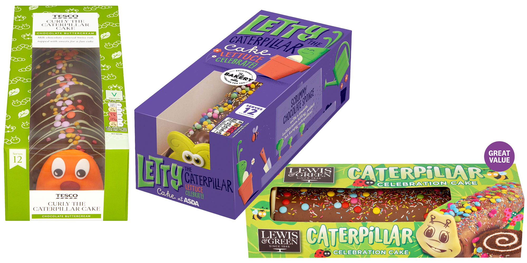 - Tesco Free From 'Stripey the Caterpillar' cake, £7.50 for 600g. Available from Tesco