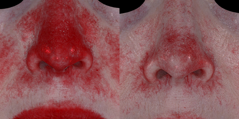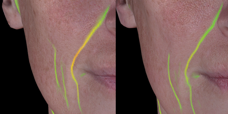 By comparing the before and after scans, we can determine which areas have improved over the six-week period. The image below shows how wrinkles around the mouth have lessened on one tester between scans (more red / orange indicates deeper wrinkles):